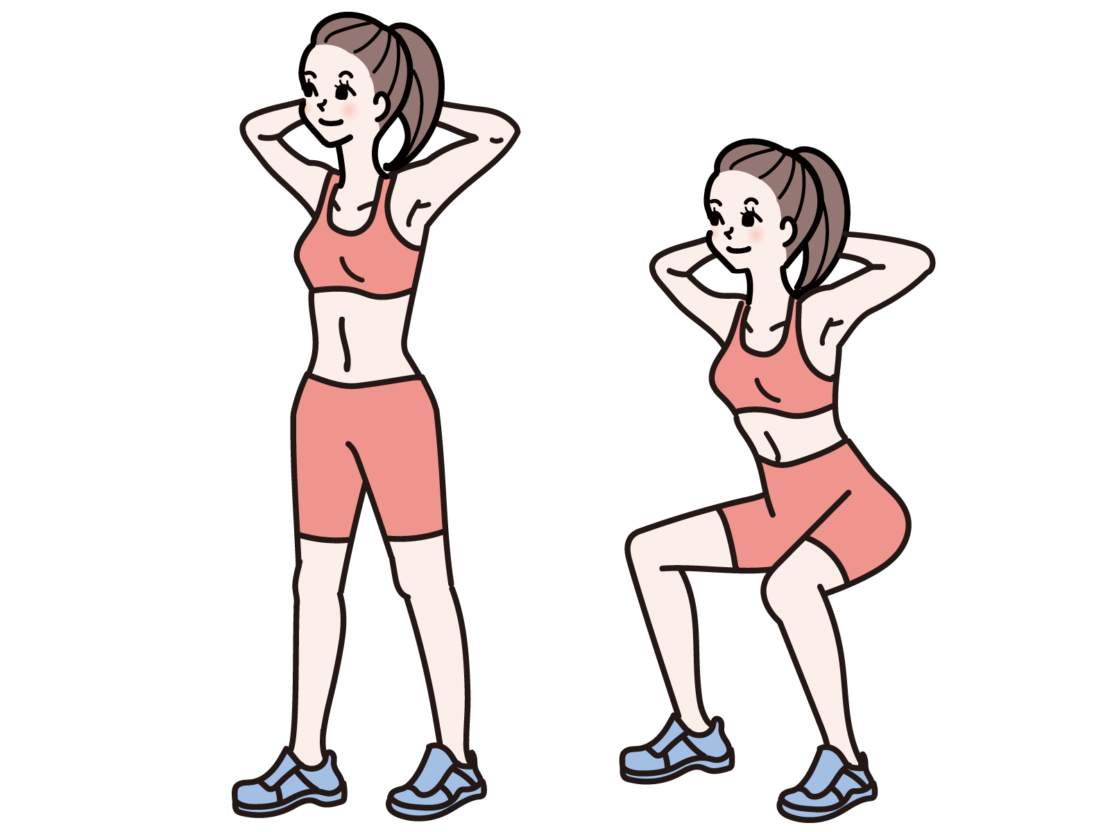 スクワットを行う際は、まず足を肩幅くらいに開き、腿と床が平行になるまで腰を落とし、ゆっくりと元の態勢に戻します。腰を落とすときに、背中が曲がったり、踵が上がったり、膝が爪先より前に出たりしないように気をつけましょう。不適切な姿勢で行うと、腰や膝を傷める危険性があります。股関節から曲げ、お尻を後ろに突き出すイメージで行うとよいでしょう。